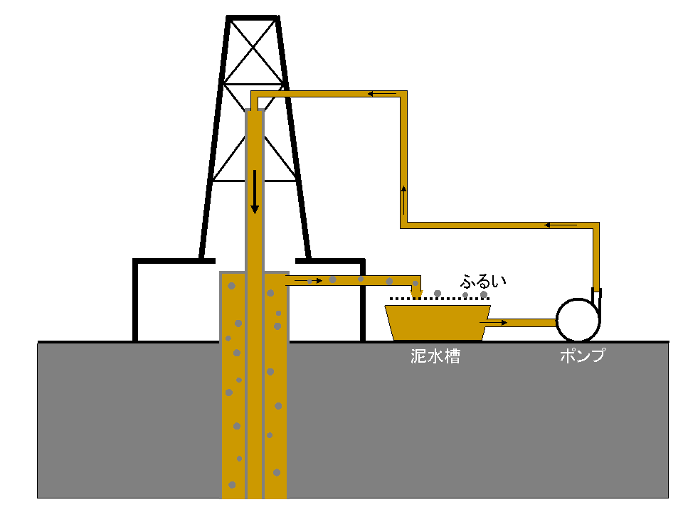 そう、地下の圧力は地表より高いから、水より重い液体を使う必要がある。そこで、水に比重の重いものを混ぜて循環させているんだ。それに掘った土が混ざるから、見るからに泥水というわけだ。