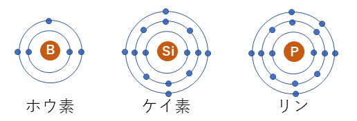 そう。このホウ素には、下の図に示すように、5つの電子があるんだけど、そのうち、結合に関係する外側の軌道を回っている電子は3つなんだ。それに対してケイ素は外側の電子が4個ある。ケイ素だけだと、この4つが他のケイ素の4つと合わせて8個になり結合として安定している。