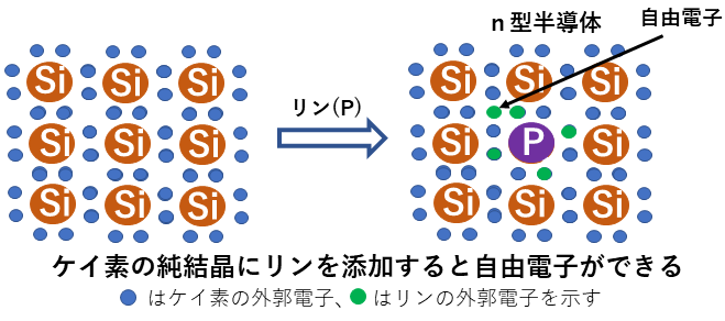 そう、だから、さっきの図に示したように、外側を回る電子が1つ多いことになる。よって、これがケイ素の結晶の中に入ると、電子が余ることになる。これが自由電子としてケイ素の結晶の中を動くことで、やはり電気が流れる環境になる。